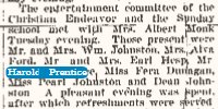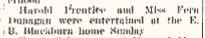 March 1922 "Harold Prentice and Miss Fern Dunagan were entertained at the E.B. Blackburn home Sunday."
