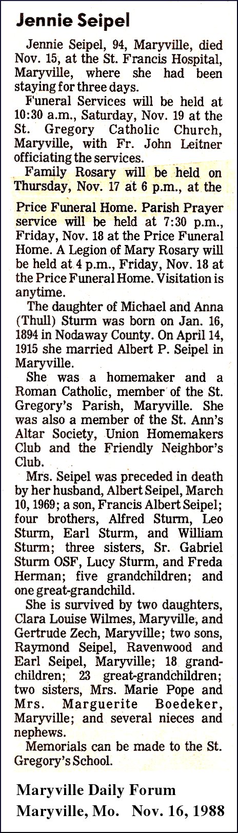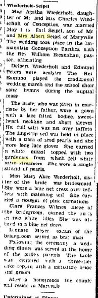 Raymond Earl Seipel, 93, Maryville, Missouri, died Saturday, June 15, 2013 at Parkdale Manor Care Center, Maryville. Raymond was born to Albert Phillip and Jennie Martha (Sturm) Seipel on September 2, 1919 at Maryville, Missouri. On January 15,1946, Raymond and Eileen Rosalia Wiederholt were married at the Conception Abbey, in Conception Missouri. Raymond was a World War II Veteran and served in the South Pacific with the US Army. He returned home and farmed in the Ravenwood area and was very involved in activites at his church, St. Gregory Barbarigo Catholic Church in Maryville. He was a former member of St. Columba Parish, Conception Jct., Missouri. He was preceded in death by his wife Eileen (June 1, 2013), son Stephen Seipel (1957), brother Francis Albert Seipel, and sisters Clara Louise Wilmes and Mary Gertrude Zech. Raymond is survived by three sons: Mark (Beth) Seipel, Macomb, Illinois, Philip (Linda) Seipel and Chris (Sandy) Seipel, both of Ravenwood, Missouri, two daughters, Julie (William) Whitsitt, Dallas,Texas and Sara Marshall, New Canaan, Connecticut, eleven grandchildren, four great-grandchildren and brother Earl Seipel, Maryville. A parish rosary will be held at 5:00 PM Monday, June 17, at St. Gregory Barbarigo Catholic Church, Maryville, followed by a visitation from 5:30-7:30 PM. Mass of Christial Burial will be 10:00 AM, Tuesday, June 18, also at St. Gregory Barbarigo Catholic Church, with burial in St. Columba Cemetery, Conception, Missouri. |