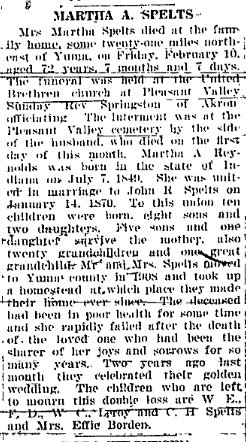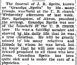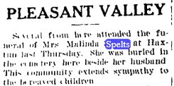 July 7, 1927 "A very large number attended the funeral of W.E. Spelts, who was laid to rest Friday. Interment was at the Pleasnt Valley cemetery."