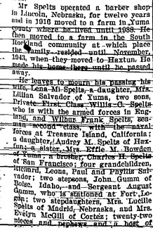 July 1914 "W.C. Spelts and family arrived from Lincoln, Nebr. having been summoned here by the death of his brother, Geo. Spelts."