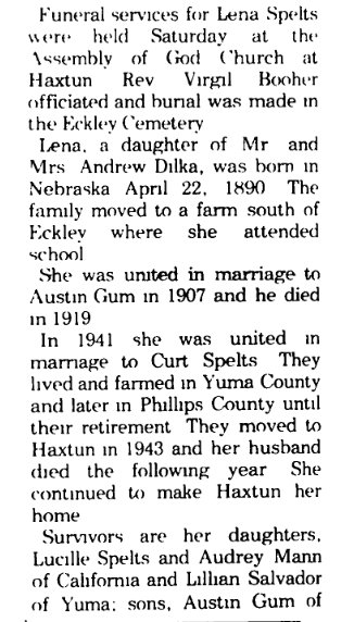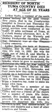 July 17, 1914 "George Spelts died Monday afternoon at his home, twenty-five miles northeast of Yuma, aged 38 years and 14 days. The deceased, who was unmarried, had been a sufferer from brights disease for the past two years. The funeral services were held Wednesday, M. Weekley officiating, and the interment was at Pleasant Valley cemetery. A father and mother, five brothers and a sister mourn his loss."