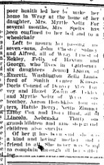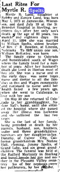 | Haxtun Harvest, Haxtun, Colorado, March 18, 1942 Maxine Fern Spelts, daughter of Mack and Elsie Speltz, was born in the Highland Center community, near Haxtun, Colorado, March 5, 1921 and passed to the home beyond March 16, 1942, at the age 21 years and eleven days. She received her early education in the Haxtun grade school, later moving with her parents to the South Rockland community. She was graduated from the New Haven high school with the class of ’39. At the age of ten years she united with the Methodist church of Haxtun, continuing her membership there until the time of her passing. On March 16, 1939, Miss Spelts was united in marriage to Wilford Wisdom of the South Rockland community. There, this happy and devoted couple spent the three years of their married life, Maxine passing on the date of their third anniversary. Their marriage was a perfect and happy relationship. In her childhood and also in her married life, Maxine was always happy, loving and faithful. She was greatly loved, and admired by all who knew her. Of her immediate family, she leaves to mourn her early passing, her devoted husband, her parents, one sister Nadine Spelts, one brother Jimmy Spelts of New Haven and her grandmother Mrs. Myrtle Spelts of Holyoke, Colorado. |