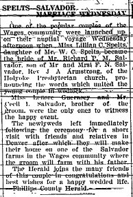 Lillian C. (Spelts) Salvador, 95, died February 27, 2002, at Haxtun Hospital. Lillian was born November 25, 1906 in Council Bluffs, Iowa, the daughter of Ivy Maude (Bowden) and Willis Curtis Spelts. In 1909 Lillian and her parents moved from Iowa to Lincoln, Nebraska. When she was seven they moved to the United Brethren community north of Yuma. Lillian's mother died when she was 12 and she made her home with her grandparents until they died two years later. At that time she went to live with her father and stepmother where she attended the Pleasant Valley School until her graduation from eighth grade. On September 16, 1925, Lillian married Richard M. Salvador. They made their home in Holyoke for a time and later moved to the Clarkville community where they farmed. Lillian was a very good cook and a renowned cookie maker. Tea at her home was always served with a batch of fresh baked cookies. She enjoyed doing handiwork and making crafts such as doilies, afghans, and pillowcase dolls. Lillian was a member of the Order of Eastern Star for 54 years. Survivors include: daughters Leona Hunt, Haxtun, and Phyllis Ashton and husband Bill, Arvada; sons Paul Salvador and wife Joan, Haxtun, and Richard Salvador, Greeley; sister-in-law/cousin Lorena Salvador, Yuma; brother-in-law Perk Salvador and wife Muriel, Yuma; sister-in-law Mary Newbanks, Wray; half brother Wilbur Spelts, Wyoming; half sister Audrey Mann, California; seven grandchildren; four step grandchildren; eight great grandchildren; five step great grandchildren; one great great grandson; and one step great great grandson. Lillian was preceded in death by her husband; an infant son; son-in-law Charles Hunt; daughters-in-law Florence Salvador and Dorothy Salvador; and half brothers Willis and Glenn Spelts. Funeral services were held on March 4, at the Haxtun United Methodist Church, Haxtun, with Reverends Mike Bergman and Jon Shaw officiating. Burial followed at Haxtun Cemetery. |