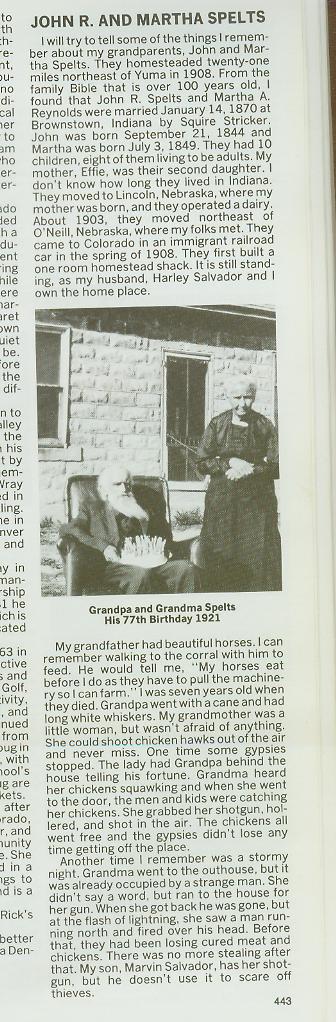 In 1920, still without kids in Yuma County. In 1930 Yuma County, Roy 47, Jennie 47, and her brother Alfred T. Sailer 44, all born in Indiana.In 1912 Leeroy (sic) Spelts proved up one quarter in 5N 47W and an adjoining one in 4N 47W.