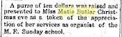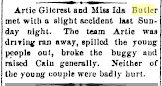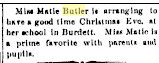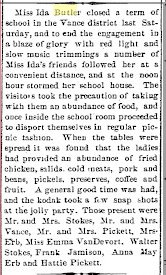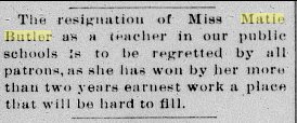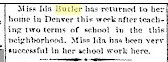 March 1895 the meeting of the Epworth League in Akron included recitations by Ida Butler and Matie Butler. September 1895 Akron "Miss Matie Butler is assistant to the principal of the Fort Morgan public schools." "Miss Matie Butler is expected home this evening from Fort Morgan to remain over Sunday with her mother." August 1896 Akron "Miss Ida Butler reached home yesterday morning from Chicago." Mrs. Effie Butler is a dressmaker in 1894 Akron Colorado, and W. B. Colvin is a real estate agent there. November 1897 "Switchman John Humphrey has moved his family from McCook and lives in the building formerly occupied by Mrs. Butler." 1897 Akron "W. B. Colvin came down from Denver Monday, on business." William B. Colvin dying May 24, 1929, is buried in Denver # 92920650. August 1897 Akron "Miss Ida Butler accompanied Mrs. Stokes home from Denver, and will cultivate the young ideas at the Star school this winter." September 17, 1897 "A trip to the building on Wednesday found a large force at work painting and oiling floors, arranging the hot water registers, cleaning floors and removing litter, which showed a determination to have all ready for school work at the time set. "The assignments of teachers are as follows: "W.W. Remington, principal; First Grade, Miss Susan Goddard; Second and Third Grades, Miss Jenni Putnam; Fourth and Fifth Grades, Miss Baker; Sixth and Seventh Grades, Miss Matie Butler; Eighth Grade, High School Miss Barbeau. "The seats and furniture are being placed in position now, and the heating apparatus was tested and found to do the work well. "It does one good to see the large, airy and well lighted and ventilated rooms, which have been provided for our children, giving assurance of health for them through their home school life. "Of the instructors, Prof. Remington and Misses Goddard and Butler are now entering upon their third terms, each having proven themselves properly placed, their work speaking of itself, and we have no doubt the new ones will prove equally well fitted." 1897 Fort Morgan
