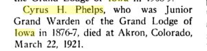 1903 Fort Morgan "Bert Phelps, manager of the R.M. Lumber Company yards at Brush, was a visitor in town Wednesday." In 1904 Albert E. Phelps and Cyrus H. Phelps were members of the Fort Morgan Masonic Lodge.