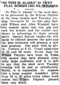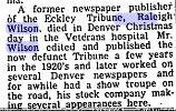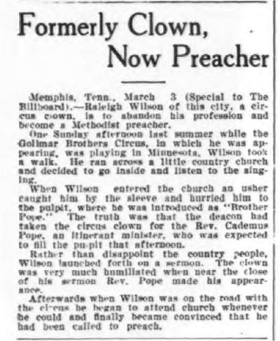 Raleigh Wilson has about one of the poorest single acts in the business, and he has not met with any success at all. He can not get return dates, and has only two weeks booked between April fools' day and Christmas. Mr. Wilson says so himself. The press and public have been unanimous in roasting him. Wilson has signed with Campbell Brothers as principal clown - his third year with them.