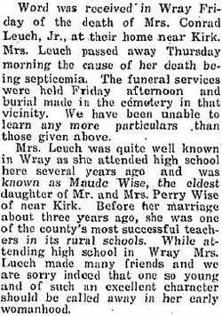 "Maude" Wise was in Kirk in 1910, 20, born in Nebraska, with parents Perry P. and Addie.
