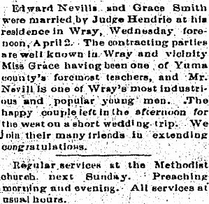 1909 Wray "Deputy Sheriff Nevills made a trip to the South Divide Tuesday."