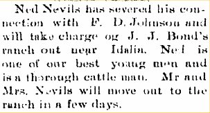 June 10, 1904 "Mrs. Nevils, mother of Tom and Ned Nevils living near Idalia, died the first of the week and was shipped to Iowa Wednesday for burial."