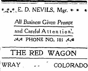1917 "Ed Nevills of Idalia, was a business visitor to Wray last Saturday. Mr. Nevills has charge of the Conrad garage at Idlia (sic)"