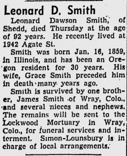 Leonard's wife Alice K. (Bailey) Smith, also buried in Wray, in 1928., with the obituary says her daughter is Grace Nevils, residing in Oregon.