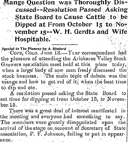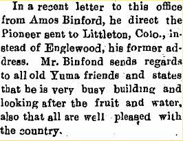 1910 Yuma "Amos Binford, of Petersburgh, was down looking after his ranch interests this week." (Petersburgh is now Littleton)