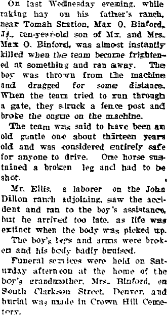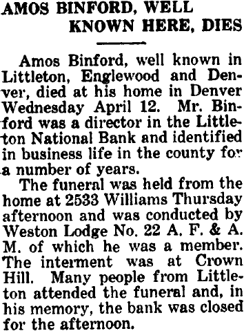 Fort Collins "Mr. and Mrs. J.N. Binford of 1121 Remington street went to Denver Thursday morning for the day, to attend the funeral of Mr. Binford's brother, Amos Binford." J.N. Binford's will was probated in Larimer County March 1945.