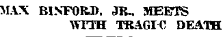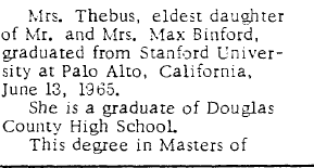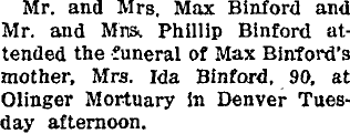 1913 "Miss Berda Binford came in Wednesday afternoon from her home at Petersburg for a visit with her brother, Max, who lives southeast of town."