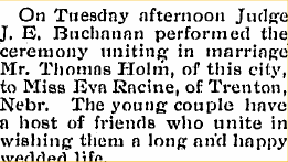 Eva Racine married Thomas Holm July 2, 1912 in Yuma