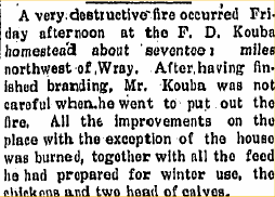 December 1912 "Mr. and Mrs. J.M. Hawes of Dunkin, Oklahoma, arrived in Wray Tuesday night and were taken out to the home of their son-in-law, Todd Kouba, Wednesday. Mr. and Mrs. Hawes will locate here permanently."