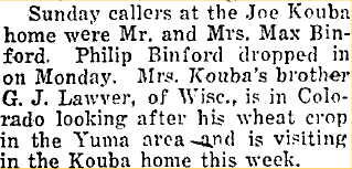 December 1910 "R. C. Kouba and wife arrived Thursday from Oklahoma to make their home in Yuma County."