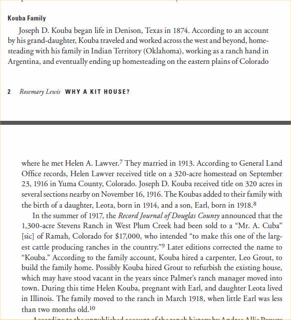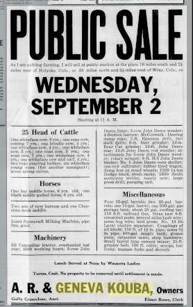 1917 "Mr. and Mrs. J.D. Kouba of Happyville were in Wray Saturday fixing up the necessary papers in the purchase of a ranch near Castle Rock."