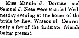 In 1910 Yuma County Samuel J. Ness 30, Missouri and Minnie 26, Nebraska have been married four years. Sam's brother Leroy R. is farming in Morgan County, and his mother-in-law is living with them.