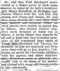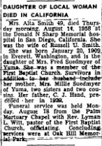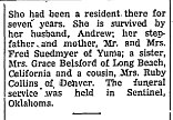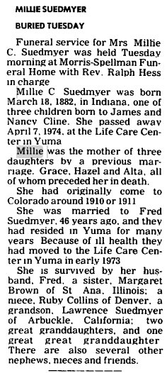1946 "Mrs. Fred Suedmyer of Denver spent a few days this week on business in Yuma. She and her husband will return here the middle of next month to make their home."