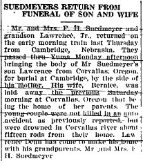 Mrs. Hazel Redfearn of Linwood, California, spent two weeks at the home of he parents, Mr. and Mrs. "Fern" Suedmeyer, and left on Saturday to visit relatives at Ford MOrgan before going to Denver to start home."