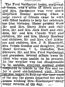 February 1927 - Schramm items - "Mr. and Mrs. Fred Suedmeyer of Brighton, Colorado, and Mr. and Mrs. Lawrence Suedmeyer, of south of Yuma, spent Tuesday night of last week at the Oliver Strawder home."