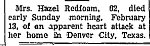 Hazel is buried in Oklahoma 66632133, with her husband Andrew Redfearn.