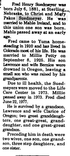 In 1940 Yuma County Fred and Millie 58 "Suedmyer", born in Indiana, have Laurence Suedmyer, 12, grandson, born in Oregon, with them. His father