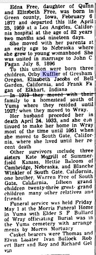 John - June 10, 1876- April 24, 1933 and Edna Feb 6, 1877 - April 25, 1959 are buried in the Yuma cemetery.
