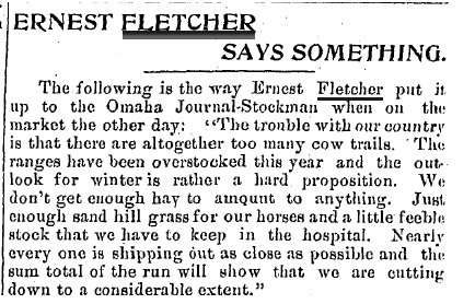 1902 "Yuma "Earnest Fletcher was in from his ranch the Fourth. Earnest's ranch is fifty miles southwest of Wray. He reports grass in that section fine and cattle doing uncommonly well."