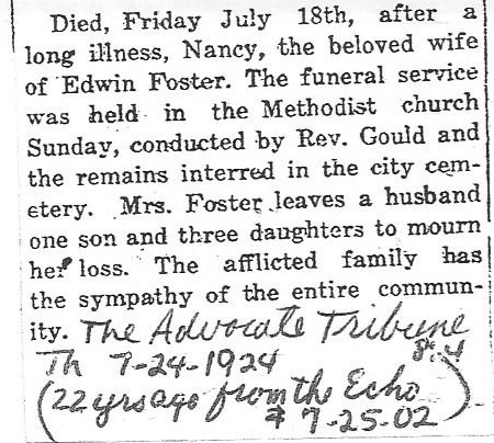 The Franklin County genweb site has a Nancy Forster/Foster -1849-1902 with a card in the index,