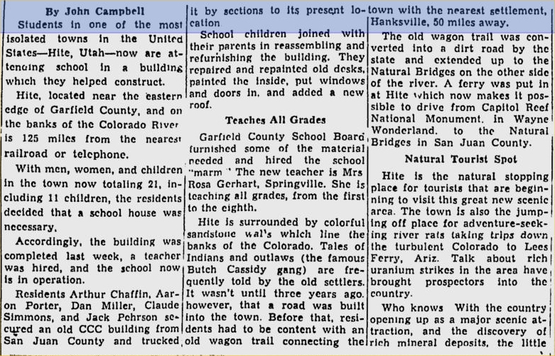 NEPHI - ' Now in her 87th year, Rosa Cunningham Gerhart, of Nephi, admits life has been interesting. She has traveled by wagon, homesteaded in Eastern Colorado, taught school in Hite, helped with old-fashioned threshing, and has helped her husband run a machine shop and a saw mill, prospect for uranium, pan for gold and operate skating rinks in Utah and Juab Counties. Born in Rooks County, Kansas, in 1888, Mrs. Gerhart has recorded some of the happenings with a $4.95 box camera, which was twice dropped into the Colorado River but was rescued for further use. She said when she was a small girl her mother's failing health prompted the father to take her back to Iowa to see her parents. The family of six made the trip in a covered wagon and remained there until the mother's death two years later. Her father remarried, then homesteaded in Western Kansas. Mrs. Gerhart pursued her education until she was able to attend a normal school and become a teacher. From the time she was 16, she did the cooking for the threshing crew that moved from farm to farm during harvest. During the annual harvest she met Charles Gerhart and the two soon married. With him began a life of homesteading, threshing, custom plowing, running a machine shop and later a sawmill, prospecting for uranium and panning gold on the Colorado River. Mrs. Gerhart recalls the day a brand new threshing machine exploded during World War I. She said her husband felt it was caused by the dust from smut in the wheat. The German farmer for whom they were threshing was convinced someone had put dynamite in a shock of grain. The couple first homesteaded in the Sand Hills in Eastern Colorado. The ground was so sandy the farm did not succeed. Mrs. Gerhart stated a new road was taken each time they drove to town, which was 22 miles away. The homesteaders also faced unfriendly cattlemen who would cut their fences from time to time. Another time they bought 160 acres and put in wheat. They stretched a tent for a home and her husband went into the custom plowing business. Because he was a machinist he was able to fix equipment that let him plow, disc and plant at the same time. The device was powered by the threshing machine engine. They had breakfast at home, but the noon meal was cooked on the hot manifold, she said. One turn around a field was enough to perk the coffee, and two rounds for potatoes. If they wanted beans the big bean pot stayed on all day. Other foods were timed accordingly, Mrs. Gerhart said. While away from the homestead and working in Yuma, Colorado, Mr. Gerhart went into the machine shop business after quickly fixing a disabled automobile. Mr. Gerhart, and a friend, Charlie Mitchell, opened the machine shop and soon had to hire two men to help with engines and big farm equipment. Mrs. Gerhart kept the books and rode the train into Denver to get new and used parts for the machinery. Later, while the couple was recuperating from measles, a cyclone destroyed the machine shop. She also recalls a worker was carried through the air for two blocks and another had his lungs "punctured by broken glass. " She recalls seeing the two-story hotel lifted from its foundation and a man sucked through the small opening while the building was suspended in the air. The building then settled on the foundation, with a slight maladjustment. During the 1930s the couple and their small son moved to Elizabeth, Colo, where her husband went into the sawmill business. After that Mr. Gerhart staked mining claims along the Colorado River where they found uranium and erected a mill. Later they moved downstream and Mr. Gerhart would be absent for several months at a time in order to secure work in town. She helped a neighbor lady, whose husband was also working away, to milk her cows. The two women stayed together during the nights and Mrs. Gerhart crossed the river twice daily to take care of the place. Mrs. Gerhart also acted as midwife during her rural years. After a short stay in Springville in the 1940s, the Gerharts and their two sons moved to Hite, Garfield County, where she taught school because no other teacher could be found. The school was supplied books out of her book barrel. She was the only school teacher in the history of the community and taught in 1948. At that time the nearest telephone was 125 miles away and the movie projector was powered by a generator. Hite is now the jumpoff point for Colorado River runners, she noted. Later, the family operated a skating rink in Mapleton and Spanish Fork for three years, then moved to Nephi where Mr. Gerhart died. Today, Mrs. Gerhart spends her days oil painting, sketching, sewing on her treadle sewing machine and gardening. THE GERHARTS, Rosa and Charles, had this photograph taken in Denver at a time when they were living near Yuma, Colo. That was during World War I, according to what was written on the "penny" post card into which the picture had been made. The Glen Canyon Reader "Hite's Crossing lies downstream six miles from the mouth of the Fremont River, and a mile below White Canyon's mouth in Glen Canyon. Here the canyon is wide and shallow. In 1883 Cass Hite settled here and the mining boom colony became known as a crossing of the Colorado River...... 1935 "all of us were reluctant to leave Hite this morning at 9:30 a.m. We have had a good time and the rest was most welcome. In the boats with us were Charles Gerhart and his son Elmer. They operate a mine below Castle Butte, and we took them there. Their mining outfit is unique and again reveals the ingenuity man is capable of in eking out a living from God's earth." 1948