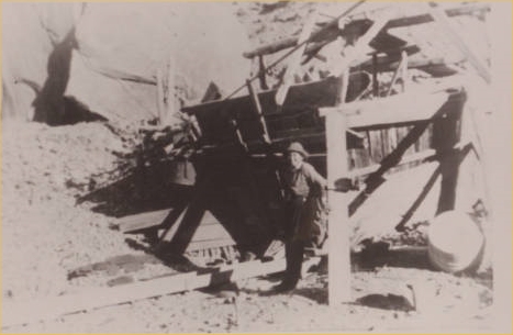 1949 Elmer Gerhart (age 9) standing by his father's (Charley Gerhart) placer shute on the "Dorothy Bar" , across the river from Chaffin Ranch.