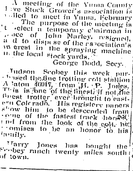 1905 Yuma "Mr. Scobey and little grandson, of Denver, came down Friday evening and were out to Mr. Scobey's ranch near here for a few days, looking after Mr. Scobey's property interests."
