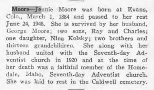In 1930 Ada County, Idaho, George E. is 59, Jennie E. 46, with Raymond 25, Charles 20, Leonard 17, and Nina 15. George and Jennie are alone in 1940 Owyhee County, Idaho. Alice M. Moore, born October 22, 1853 in Canada to "J.S. Harrison" and "Miss Dean", died in Caldwell Idaho September 1, 1934, buried in Canyon Hill, informant George E. Moore. The stone says "Alice Medora Moore", per # 115621942. George E. Moore 1880-1970 and Bessie 1885-1947 are buried in Canyon Hill, Caldwell, Idaho # 85045882.