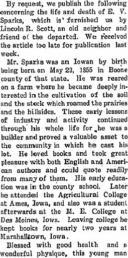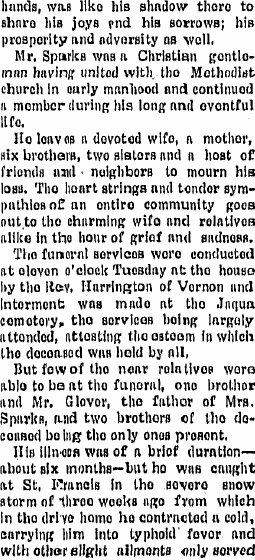 Funeral services were held at the home Monday, July 8 at 3:00 o’clock p.m., conducted by Rev. Reel, pastor of the Christian Church of Sargent, Nebr., and the remains laid to rest in the Dry Valley cemetery. The services were attended by a large number of sympathizing friends and neighbors who came to pay their last respects to an upright man and neighbor.