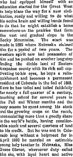 Mr. Glover was a man of more than ordinary attainments. He was well versed in the questions of public welfare that were constantly coming up for settlement for the benefit of the people of the state and nation, and took much interest in public affairs. He was an ardent supporter of prohibition and gave all his influence to making Nebraska a dry state. As a farmer and stock-raiser he made a success second to none in the county of Custer. He was a lover of fine stock and made it his business to raise fine cattle and horses. That he made this business pay in dollars and cents is attested by the finely improved farm he enjoyed in his latter years.