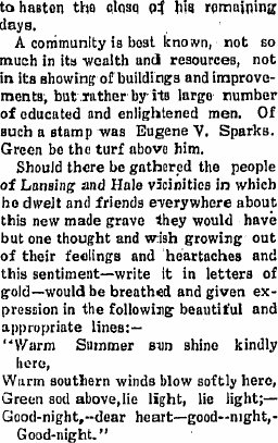 His father died in 1844, leaving the mother and three children to fight life’s battles without the care and protection of a husband and father, Samuel L. being twelve years old at the time. After the death of the father the family moved to a factory town and the children were put to work in the factories while the mother kept a boarding house, thus winning for themselves a living. From here they moved to Erie Co., Pennsylvania when S. L. was about 18 years old and went on a farm where he and his brother farmed. Samuel was an apt pupil and a great reader and acquired a good education and at the age of 21 or 22 taught school where he became acquainted with and attached to Miss Jane Dunn, one of his pupils, and on October 18, 1854, they were united in marriage. To them were born six children, three girls and three boys, Deett, Mrs. J. W. McRoe of La Veta, Colo., Mrs. Mary Potter, Mrs. Grace Sparks, H.B., P.D., and S.L., jr., all of whom, together with the aged wife and twenty grandchildren, survive, all being present at the funeral.