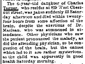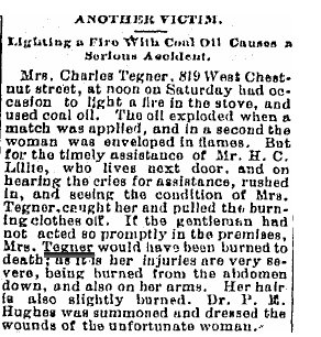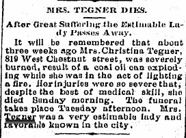 October 24, 1889 "Mrs. Charles Tegner ... is still in a dangerous condition."