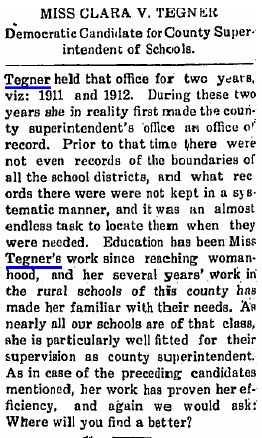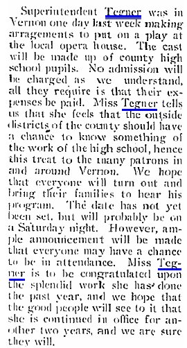 1905 Wray "C.E. Tegner, of near Jaqua, Kansas, was in town a few days looking after business and looking over some of the town property with a view of purchasing. Mr. Tegner is talking some of locating in the county seat."