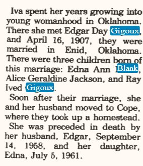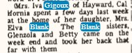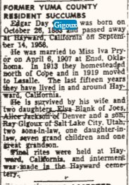 September 18, 1958 "Mrs. Edva Blank received word on Sunday that her father, Ed Gigoux of Hayward California had died early Sunday with a heart attack. Edva left at once for Denver and accompanied her sister and husband, Mr. and Mrs. Roy Jackson. She phoned back that the funeral was being held at 'Wayward' on Tuesday afternoon and interment made thre."