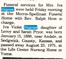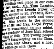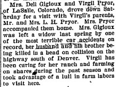 March 17, 1938 "Virgil Pryor of LaSalle and Mrs. Gigoux of Evans were issued a marriage license. Virgil is the eldest son of Mr. and Mrs. Lloyd Priyor and a former Joes boy."