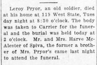 In 1900 Garfield County, Oklahoma, Leroy Pryor born Oct 1849, married 35 years to Sarah January 1850, both bon in Ohio. Loyd H. was born January 1879, Effie R. Feb 1882, and Ivy V. January 1888, all three in Kansas.