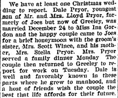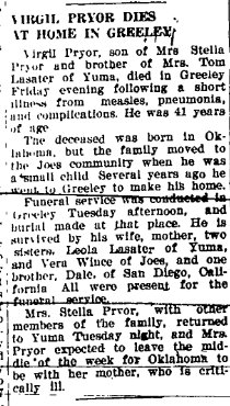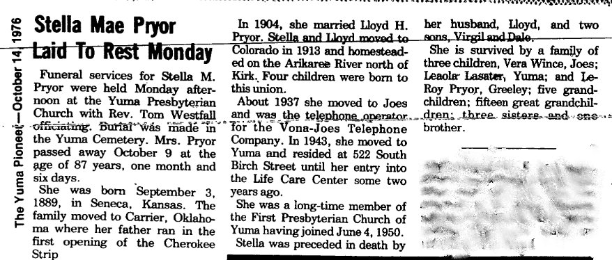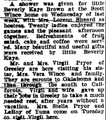 In September 1965 "The Scott Winces were in Yuma Sunday attending a family dinner at the home of Mrs. Stella Pryor. An honored guest was Mrs. Della Pryor of Greeley, wife of the late Virgil Pryor."