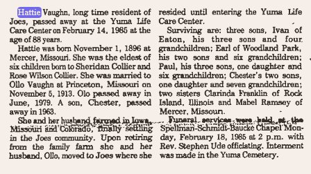 Olio Ivan Vaughn, long-time resident of Joes, passed away at the Yuma District Hospital on June 2,