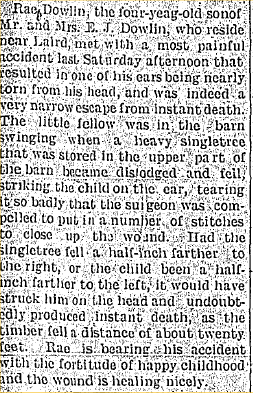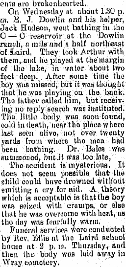 1902 "Warren Hawkins, brother of Mrs. F.J.(sic) Dowlin, who has been visiting in the Dowlin home east of Laird for some time, returned home the fore part of the week."