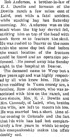 1906 "Ross Anderson of California and Robb Anderson of New Mexico, brothers-in-law of E.J. Dowlin of Laird, have leased the Dowiln (sic) ranch for a term of years, and will soon take possession."