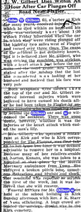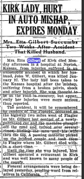 "The entire community was shocked to learn of the tragic death of Jack Gilbert, Sr., Friday afternoon. Mr. and Mrs. Gilbert went up to Denver Sunday of last week and there purchased a car and were driving it home. When they were within a few miles of Flagler, for some reason unknown, the ar overturned a couple of times on the highway.