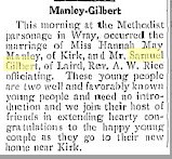 Mrs. Gilbert was born Hannah Mary Manley, on November 18, 1892, at Kirk. She spent her early life there. The Gilberts were married at Wray on April 27, 1916, and lived in Kirk until they moved to Grand Junction.